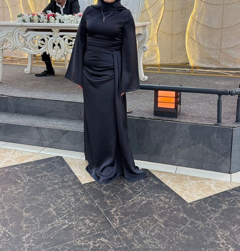 Bu uzun siyah abiye elbise, yüksek yakalı ve uzun kollu, drapeli tasarımıyla mütevazı ve rahat kesim sunar. Gotik tarzda, düğünler için uygundur.