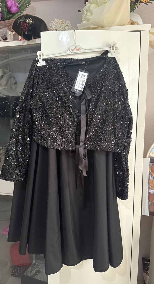 Uzun siyah gotik abiye elbise, bol kesim ve uzun kollu. Drapeli, pul işlemeli üst kısmı ve askısız yaka detayıyla parti için uygun. ✨