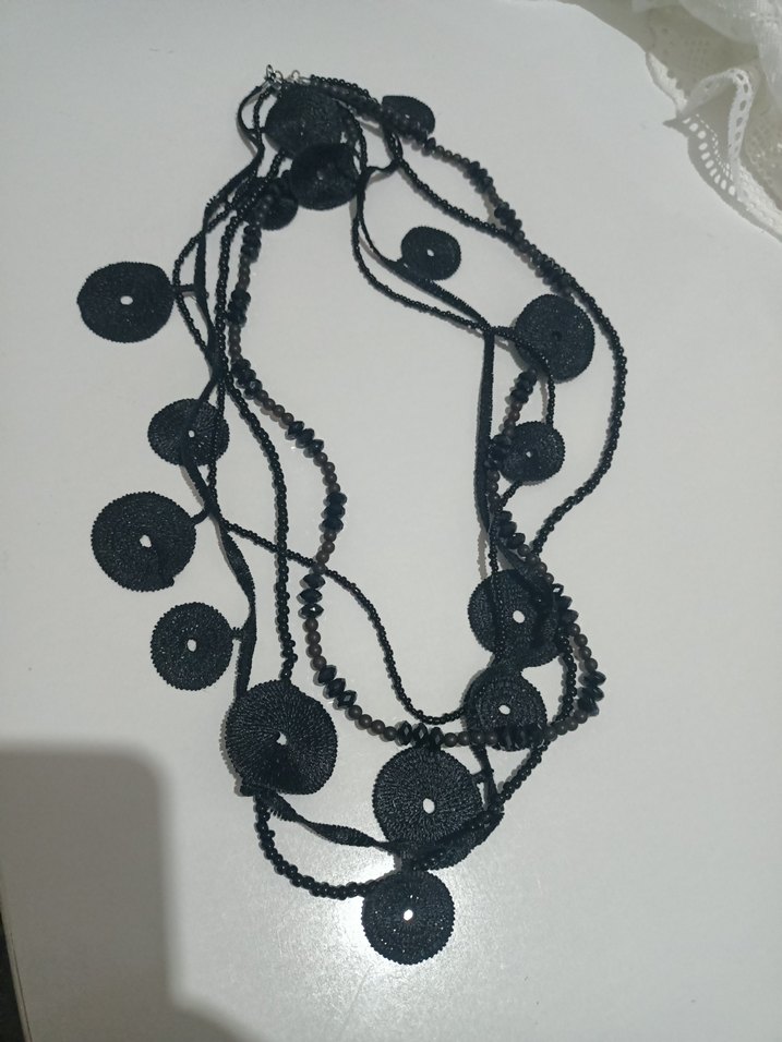 Uzun siyah kolye, boncuklu iplikler ve işlemeli dairesel detaylarla gotik tarzı yansıtıyor.