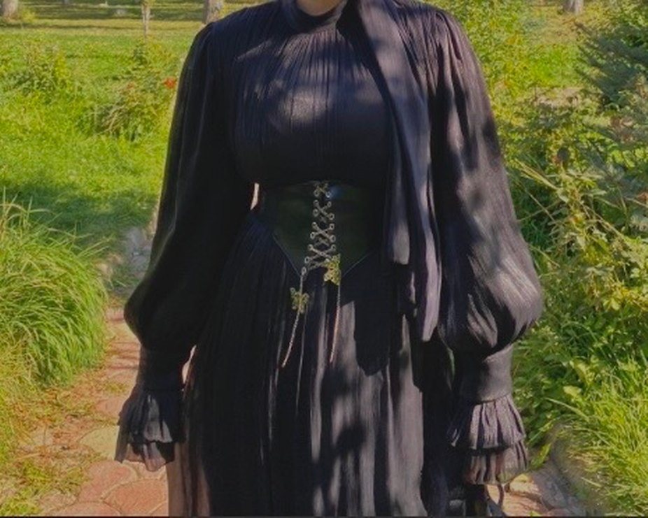 Uzun siyah deri elbise, yüksek yakalı, bol kesim ve nakış detaylıdır. Drapeli askılı kollara ve korseli bele sahiptir, gotik bohem tarzda.