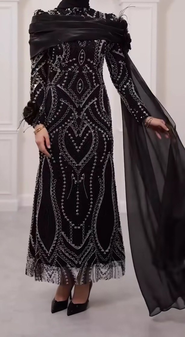 Uzun siyah abiye elbise, yüksek yakalı ve uzun kollu, gotik desenlerle süslenmiş. Dökümlü detaylı, düğünler için uygun.