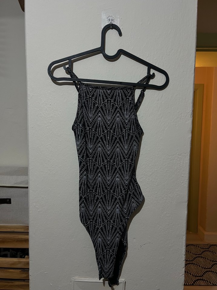 Dar kesim, ince askılı, drapeli ve koyu geometrik desenli uzun siyah kadın üst, avangard tarz için uygun.