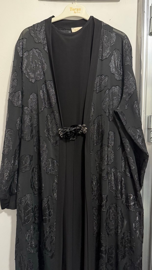 Uzun siyah elbise, bol kesim ve drapeli tasarıma sahip. Notched lapel yaka ve uzun kollu, desenli sentetik kumaftan ofis için uygun.