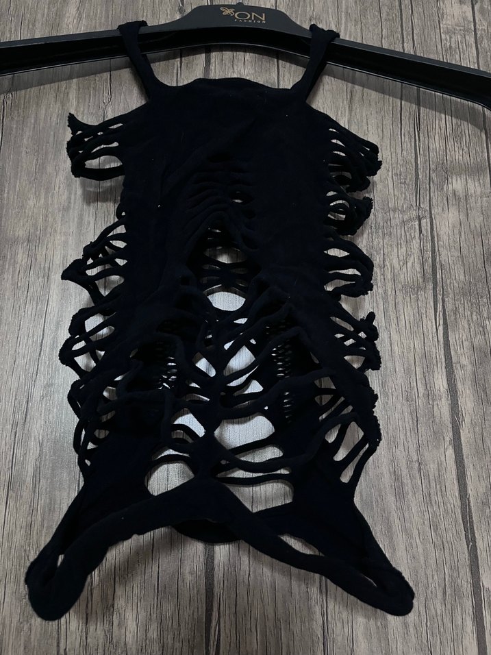 Uzun siyah sütyen, gotik tarzda baskılı ve yırtık detaylıdır, koyu ve cesur bir görünüm sunar. Gotik alt kültüre uygundur.