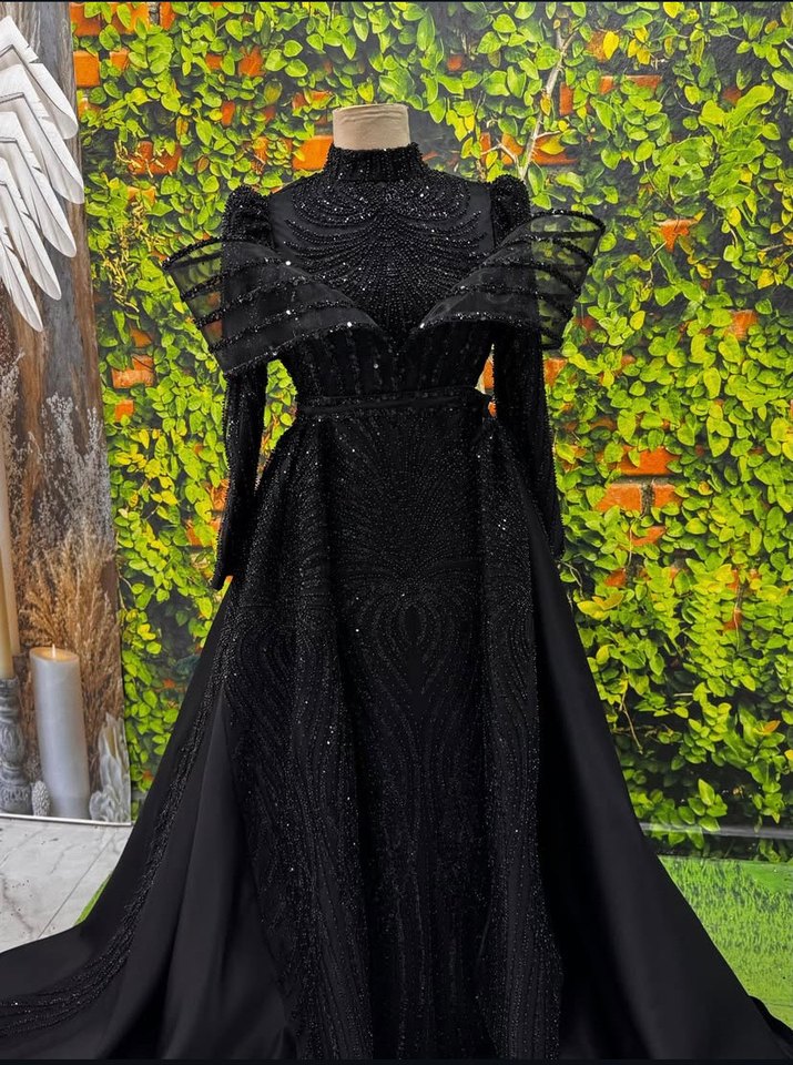 Yüksek yakalı, uzun kollu ve desenli dökümlü tasarıma sahip uzun siyah abiye elbise. Gotik stil için uygun, düğünlerde tercih edilir.