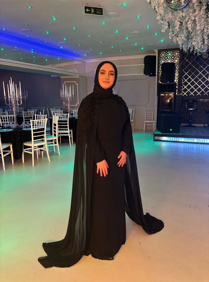 Uzun siyah elbise, yüksek yakalı ve uzun kollu, drape detaylıdır. Modest gotik tarzıyla düğünler için uygundur, rahat kesime sahiptir. 2 kez kullanıldı. Pelerinli dar kesim. Etek kısmındaki tül de çok küçük bir sökük var. Şal dahildir.