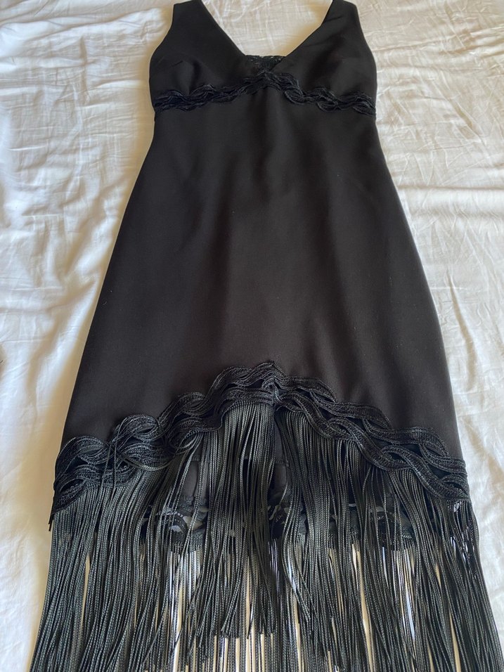 V yaka ve ince askılı, uzun siyah abiye elbise. Drape ve işlemeli detaylarla gotik tarzda, püsküllü etek ucu parti için uygun.