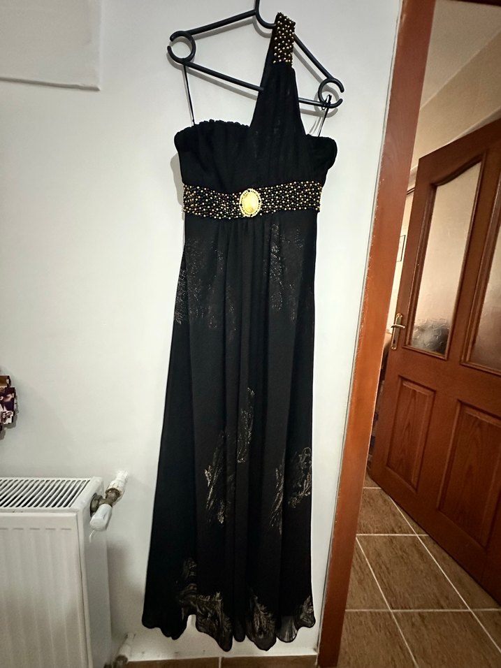 Siyah, straplez uzun abiye elbise, oturan kesim ve drapeli detaylara sahiptir. Tek askılı ve boncuklu kemer detayı vardır. Düğün ve gotik tarz için uygundur.