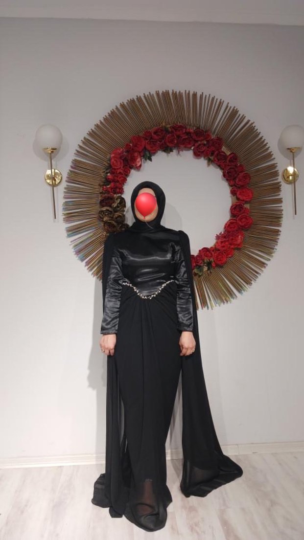 Bu uzun siyah abiye elbise, dar kesim ve yüksek yaka ile etnik detaylar içerir. Drapeli ve askılı kol tasarımı gotik avant-garde tarzını yansıtır.