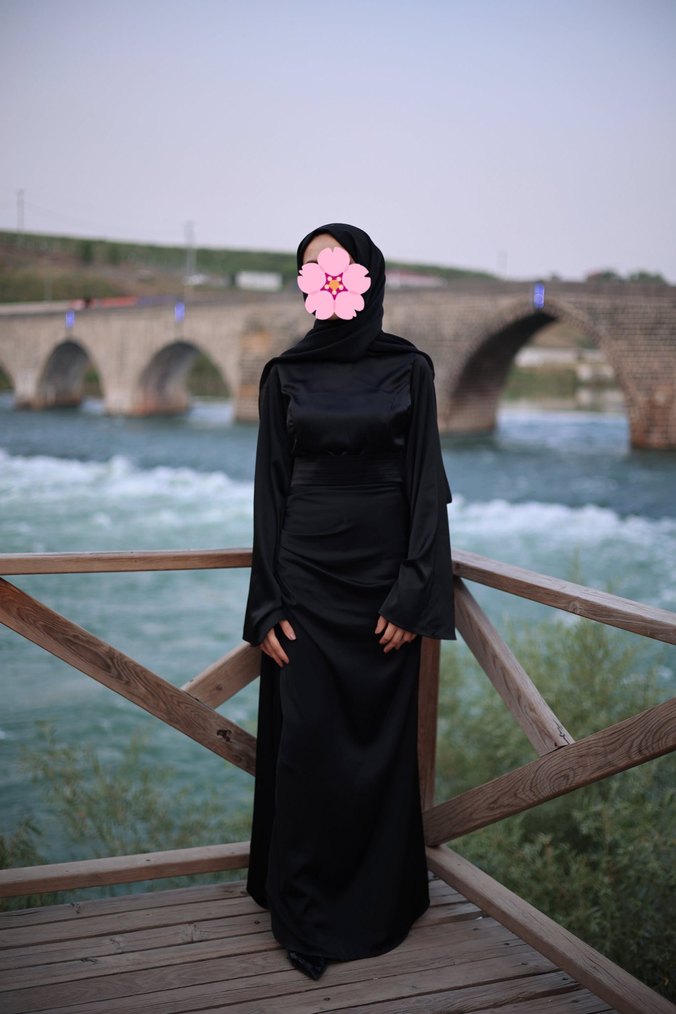 Uzun siyah elbise, yüksek yakalı ve drapeli yumuşak kumaştan, dar kesimdir. Askılı kolları ve desensiz koyu rengiyle sade ve günlük kullanıma uygundur.