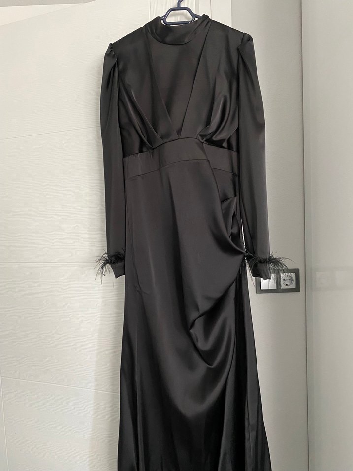 Yüksek yakalı, uzun kollu ve manşetlerinde tüy detaylı uzun siyah gece elbisesi. Drapeli tasarımı ve regular kesimiyle şık bir gotik stil sunar.