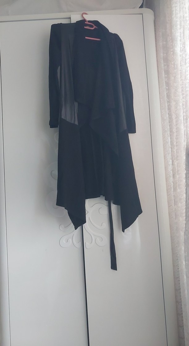 Uzun, siyah, drapeli ve bol kesim kadın hırka. Notlu yaka ve uzun kollu, sentetik kumaştan üretilmiştir. Gotik tarzda, günlük kullanıma uygundur.