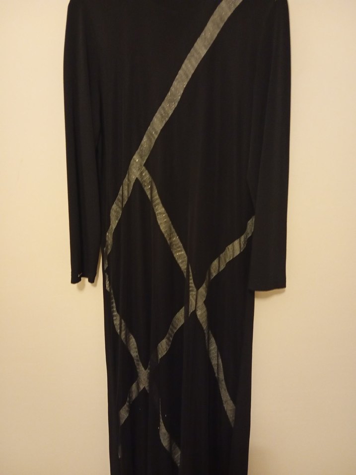 Uzun siyah elbise, yüksek yakalı ve uzun kollu, bol kesim ve drapeli tasarıma sahip. Sentetik kumaştan, gotik tarzda, ofis kullanımı için uygun.