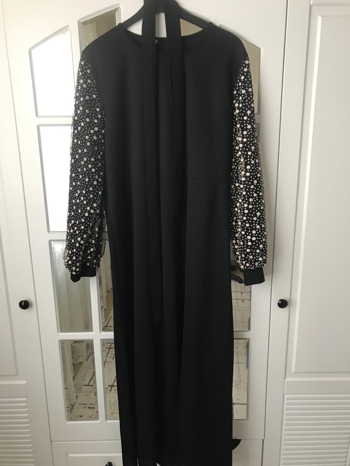 Yıldız desenli uzun kollu, yüksek yakalı, dökümlü ve bol kesim siyah gotik elbise. Günlük kullanıma uygun modest tarzda.