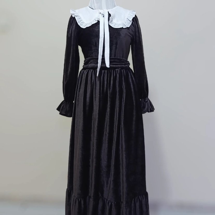 Uzun siyah kadife kumaş vintage tarzı elbise, ve beyaz yakalı detaylara sahiptir. Kolları volanlı ve kumaşı yumuşak, sıcak tutar.