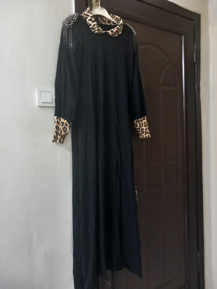 Uzun siyah gotik elbise, uzun kollu ve yüksek yakalıdır. Leopar desenli manşet ve yakası ile drapeli, modest ve bol kesimdir. özel Günler için kullanıma uygundur. özel dikim 38 bedenle 44 beden arası uyumludur esnek kumaştır
