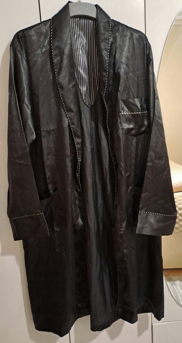 Uzun, siyah, bol kesim ve uzun kollu klasik gotik tarzda, dikiş detaylı sabahlık.
