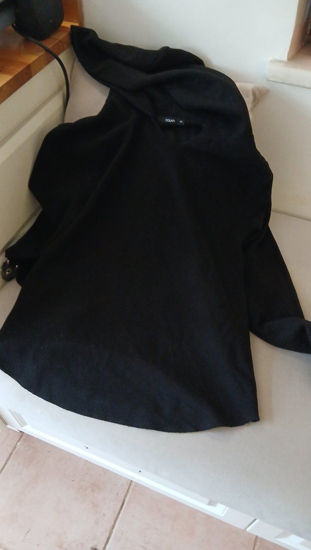 Uzun siyah erkek sweatshirt, drapeli ve kesik yaka detaylıdır. Uzun kollu, bol kesim ve desen içermeyen gotik stile uygundur.