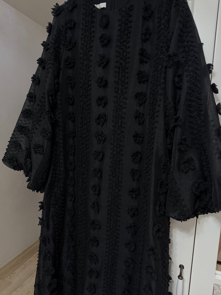 Uzun siyah elbise, fırfırlı nakış detayları, bol kesim, uzun kollu ve yuvarlak yaka ile romantik akşamlar için uygun.