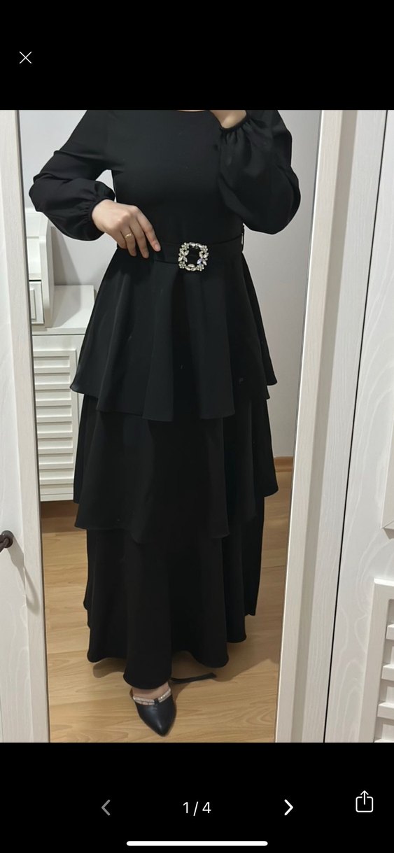 Yüksek yakalı, bol kesim ve kat kat fırfırlı uzun siyah elbise. Sentetik kumaştan, gotik tarzda ve sade bir tasarıma sahip. ✨