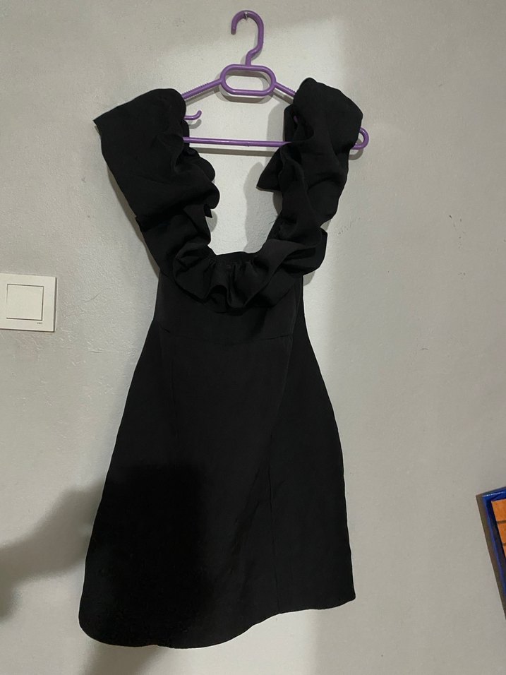 Uzun siyah abiye elbise, madonna yaka ve belirgin fırfır detaylara sahip. Kolsuz, dar kesim ve desensiz, gotik tarzda romantik akşamlar için uygun. Arkası ipli