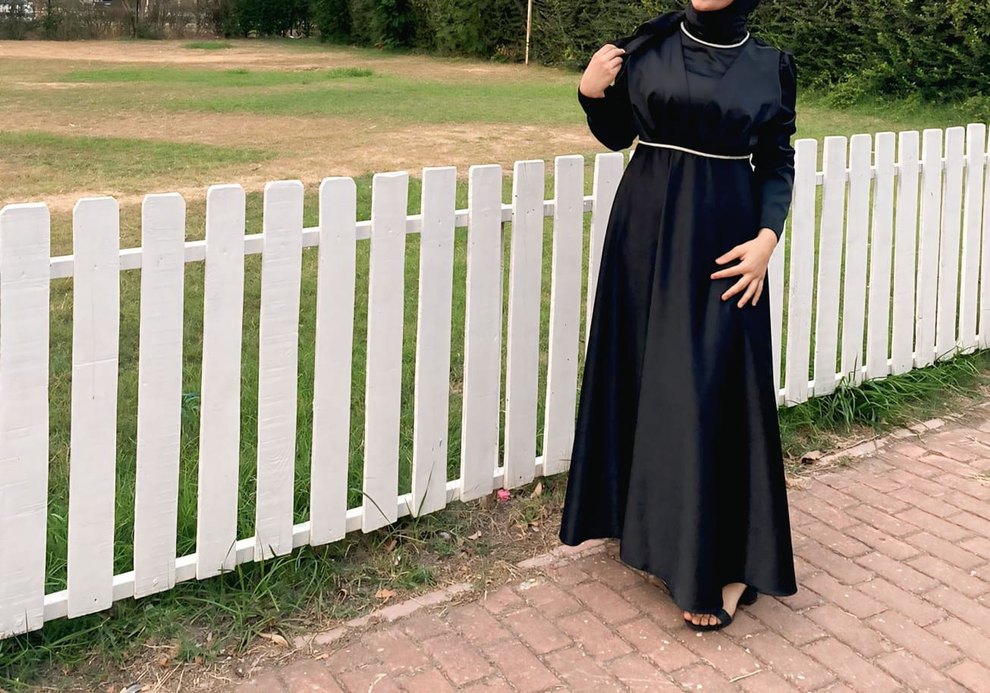 Uzun siyah abiye, yüksek yakalı ve askılı kollu, drapeli tasarıma sahip. Düğün ve gotik stil için uygun, modest ve regular fit. ufak daraltma var 38-42 beden uyumlu