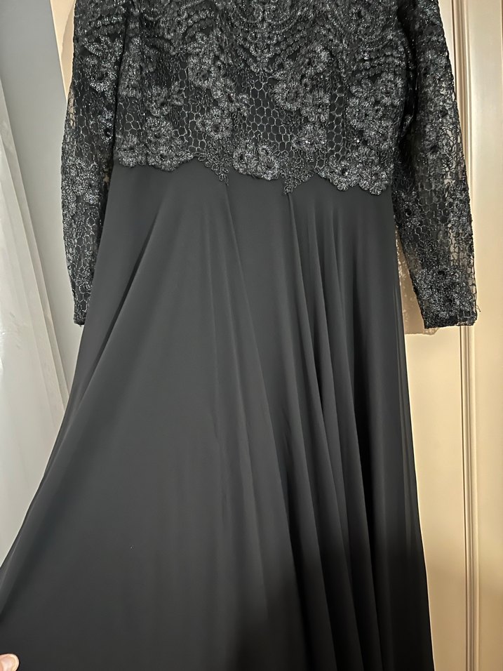 Uzun siyah abiye elbise, kayık yaka ve uzun kollu, bol kesimdir. Üst kısmı dantel detaylı, etek kısmı zarifçe drapelenmiştir, düğünler için uygundur. Hiç giyilmemiştır