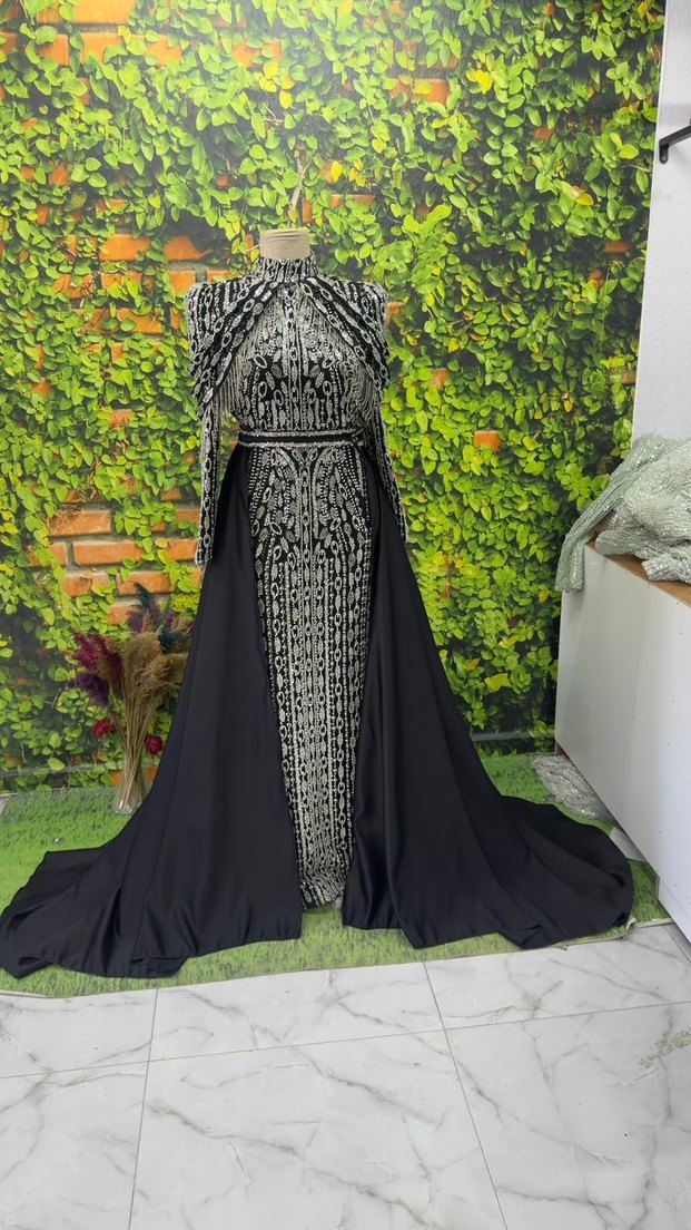 Yüksek yakalı, uzun kollu ve drapeli desenli uzun siyah abiye elbise, düzenli kesim ve gotik avant-garde tarzda, düğünler için uygun.