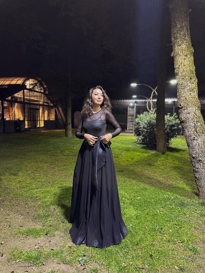 Uzun siyah elbise, drapeli tasarımı, uzun kollu ve kayık yaka ile klasik gotik şıklık sunar. Desensiz kumaşıyla sade ve karanlık bir görünüm sağlar. Her bedene göre stoğumuz vardır