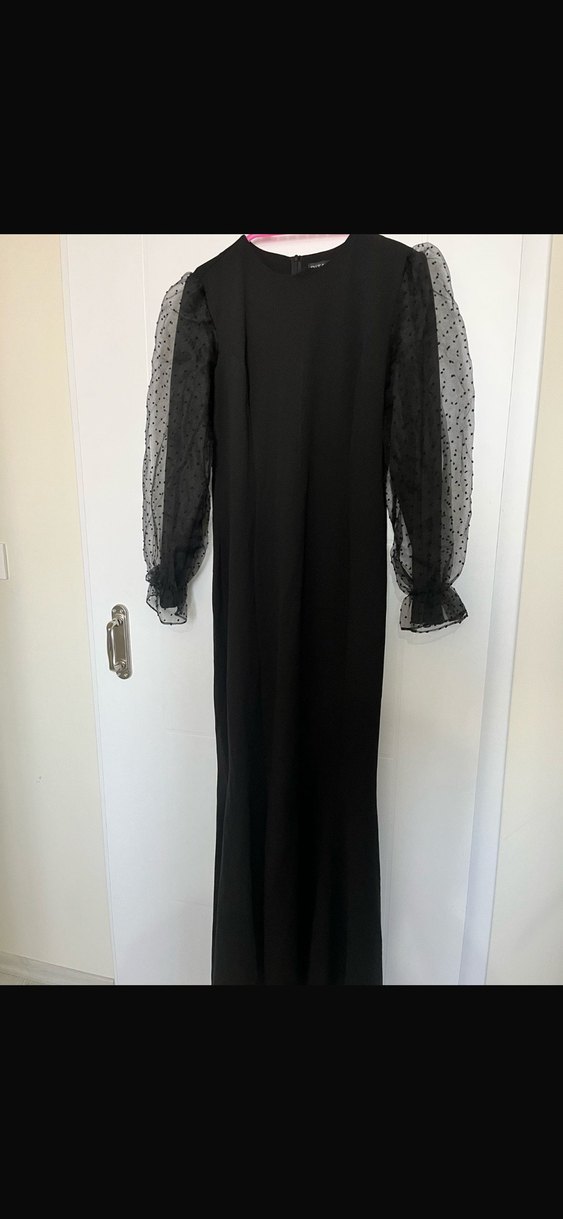 Drapeli, uzun tül kollara sahip siyah uzun elbise. Regular fit ve yuvarlak yaka ile klasik zarafeti gotik tarzda yansıtıyor. Ofis kullanımına uygun.