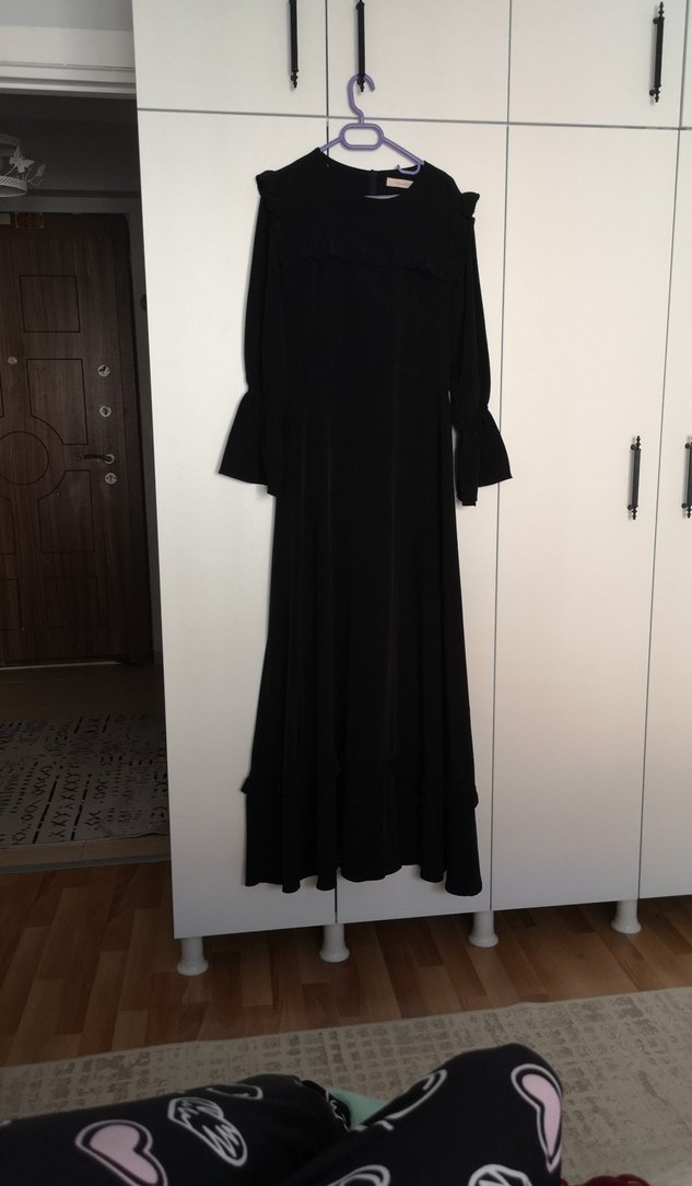 Uzun siyah gotik elbise, fırfır detaylı, yüksek yakalı ve uzun kolludur. Bol kesim ve yumuşak sentetik kumaştan, ofis için uygun.