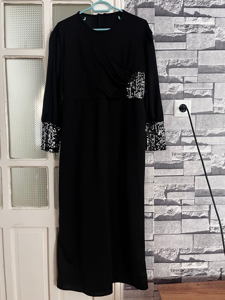 Uzun siyah elbise, uzun kollu ve yuvarlak yakalıdır. Bol kesimi ve drapeli tasarımıyla gotik ve mütevazı bir tarz sunar. Manşet ve bel kısmında payet detayları bulunur.