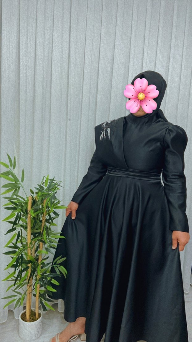 Kemeri şalı yoktur ürünün Saten kemer kullanabilirsiniz Yüksek yakalı, drapeli ve çiçek desenli uzun siyah elbise. Uzun kollu ve düzenli kesim, mütevazı tarz için uygun.