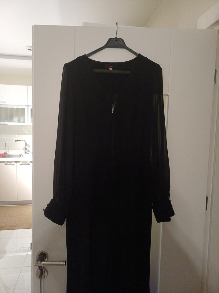 Uzun siyah gotik elbise, uzun kollu ve bol kesimdir. Satenimsi dokusu, drapeli tasarımı ve V yaka detayıyla ofise uygundur.