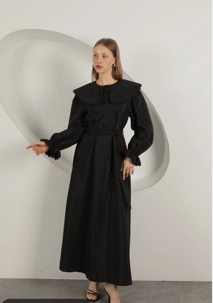 Uzun siyah gotik elbise, yakalı ve fırfırlı uzun kollara sahiptir. İpek gibi kumaştan üretilmiş olup, ofis için uygun regular fit sağlar.