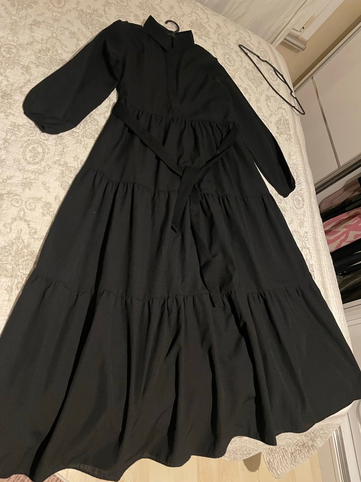 Yüksek yakalı, dökümlü detaylı siyah uzun elbise, rahat kesimli ve sentetik kumaştan. Gotik tarzda, günlük kullanım için uygun.
