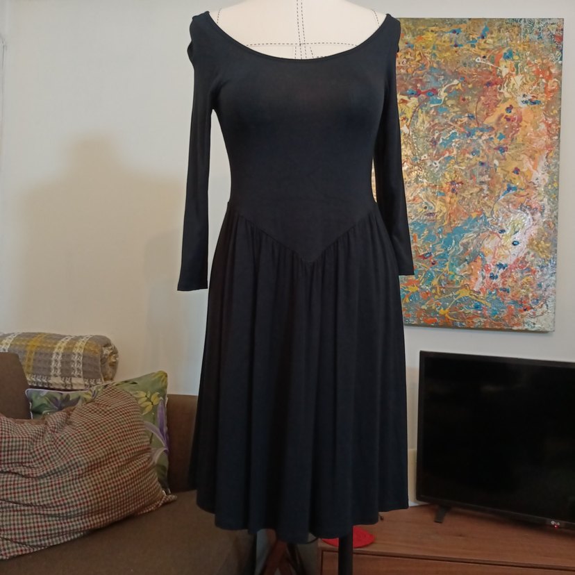 Uzun siyah tül detaylı, tek parça, gotik tarzda, kayık yaka ve uzun kollu, bol kesim, drapeli kadın abiye elbise. Ofis ve günlük kullanım için uygun.