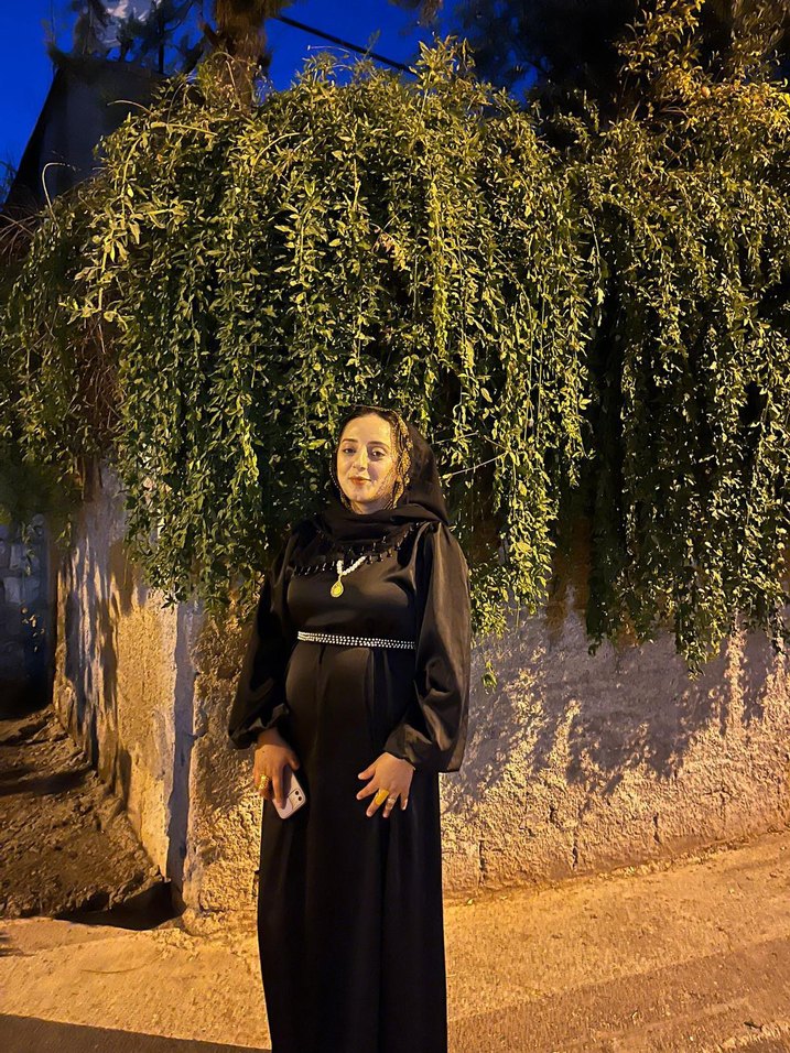 Yüksek yakalı, uzun kollu ve bol kesimli uzun siyah elbise. İpek gibi kumaştan, drapeli ve etnik desenli, mütevazı gotik tarzda. Günlük kullanım için uygundur.