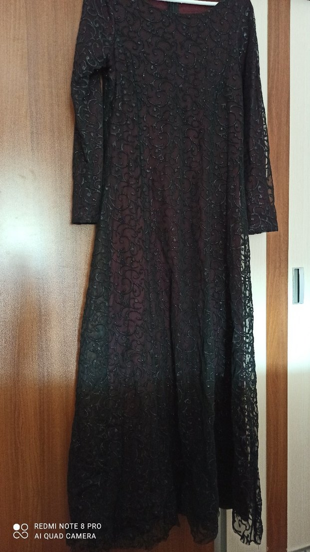 Uzun, dar kesim siyah elbise; tek renk, uzun kollu ve kayık yaka. Gotik tarzda, düğün için uygun ve sentetik kumaştan yapılmıştır.iki kol arası 52:cm elbise boyu 1:45cm