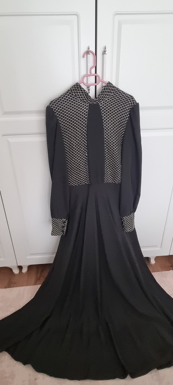 Uzun kollu siyah gece elbisesi, yüksek yakalı ve gövde ile manşetlerde pile detaylıdır. Gotik tarzda, ofis kullanımı için uygundur.
