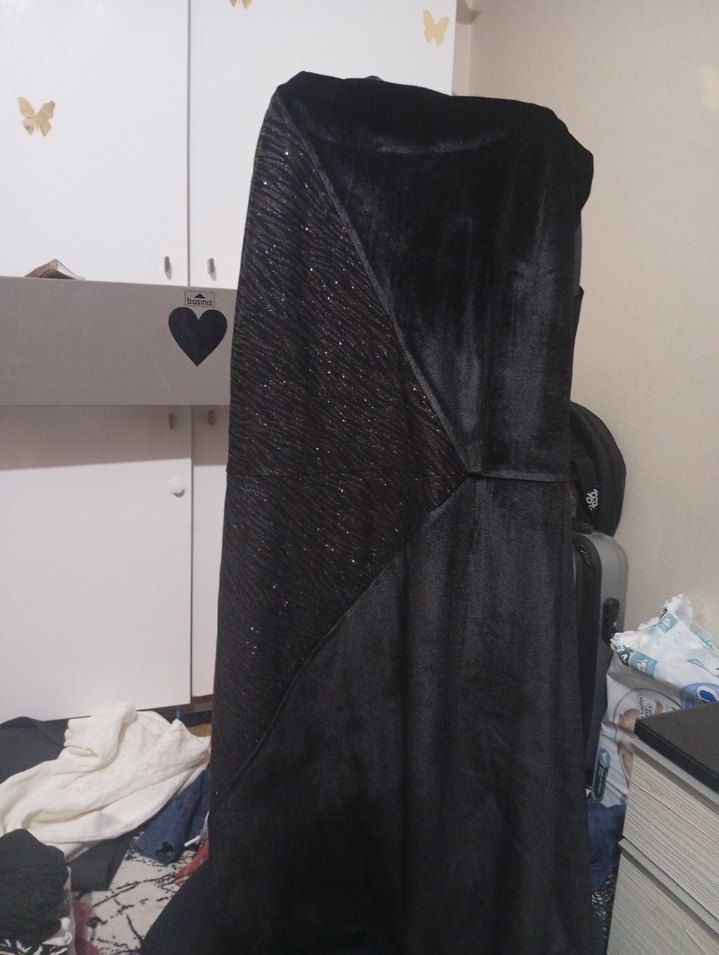 Uzun siyah gotik kadın elbisesi, vücuda oturan kesimi ve askılı kollarıyla dikkat çeker. Düz, desensiz koyu renklidir.