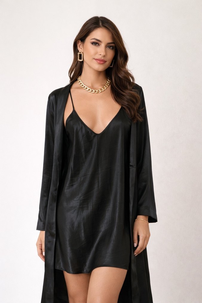 Uzun siyah sabahlık, düz kesim ve askılı kollara sahip, gotik tarzda sade ve deseniz saten kumaştan yapılmıştır. Kusursuz tertemiz bir parça