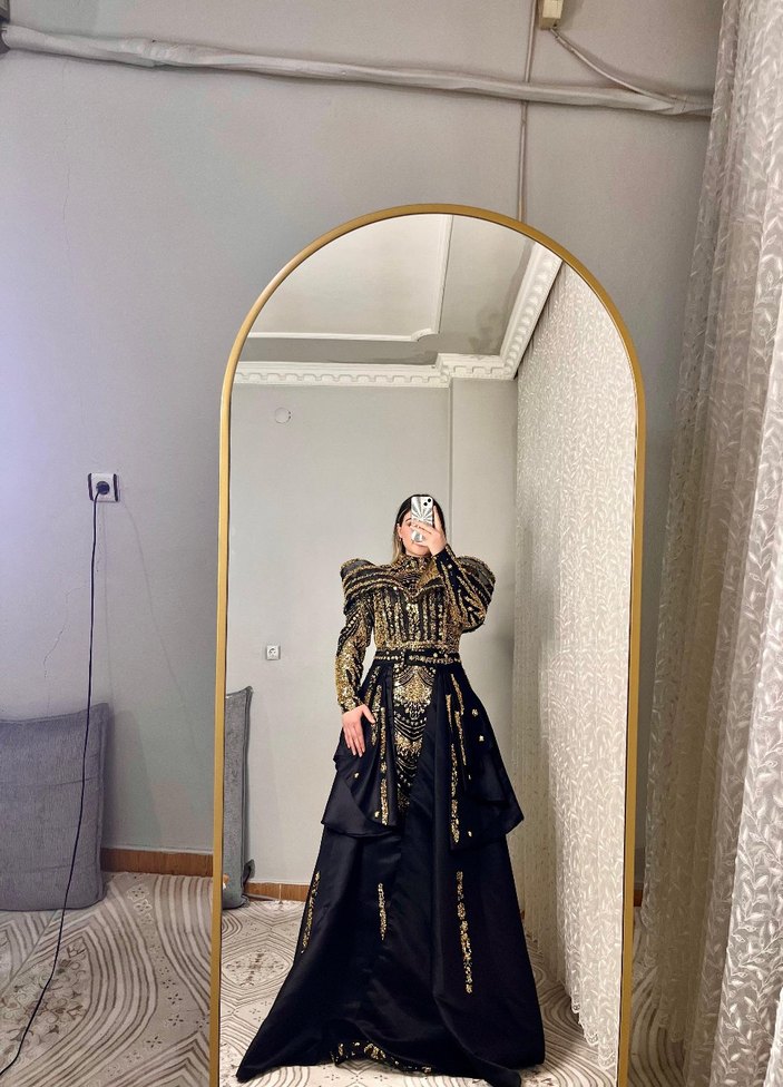 Uzun siyah gotik kadın gelinlik, yüksek yaka ve uzun kollu etnik desenlere sahiptir. Salaş kesimi ve drapeli detaylarıyla şık bir düğün görünümü sunar.