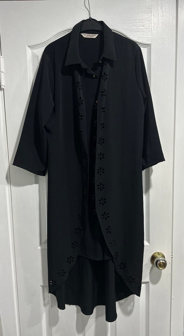 Uzun siyah gömlek elbise ,yakalı ve bol kesimdir. Önü kısa arkaya doğru uzun kesimdir. Sentetik kumaştan, nakış detaylı ve yırtmaçlıdır, ofis için uygundur.
