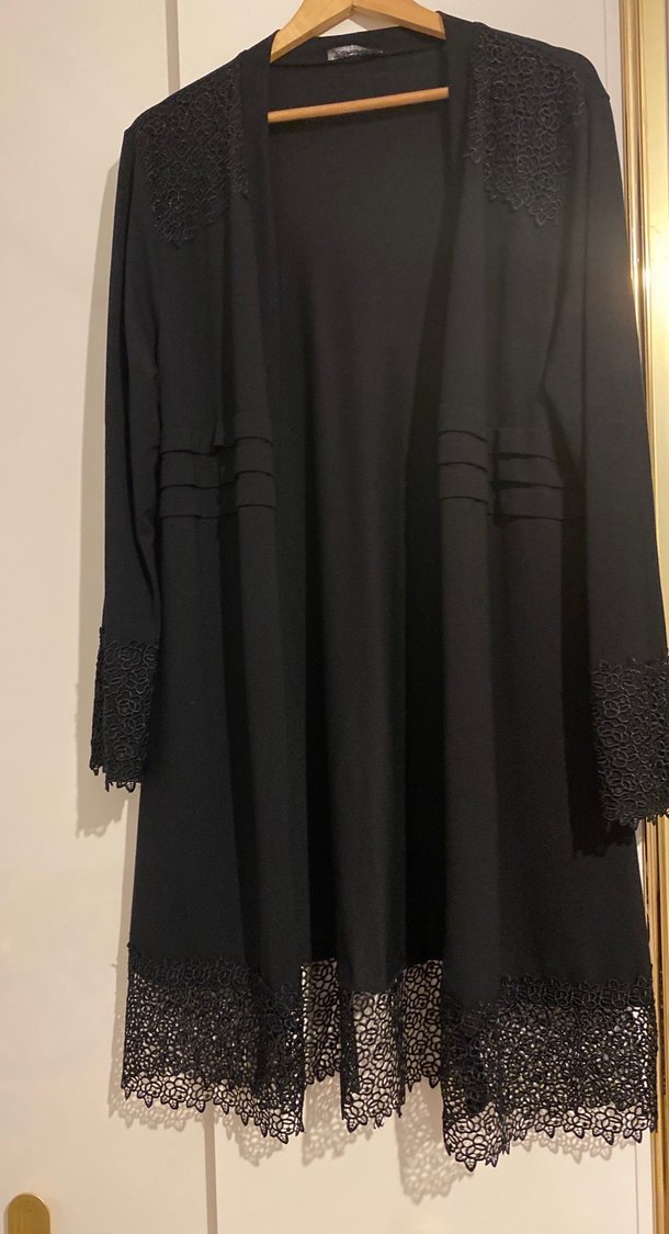 Uzun siyah sabahlık, bol kesim ve uzun kollu, manşetlerde ve etek ucunda detaylı dantel süslemeleriyle gotik tarzı yansıtıyor.