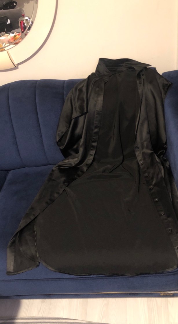 Uzun boylu, siyah, düz desenli, gotik tarzda, bol kesim ve uzun kollu kadın sabahlık.
