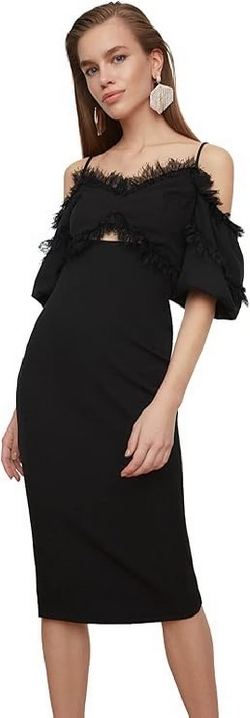 Bir kez giydim göbek dekoltesini kapattım isterseniz açabilirsiniz Uzun, siyah kalem elbise, tekne yaka ve askılı kollarla, fırfır detaylı, yumuşak sentetik kumaştan yapılmıştır. Romantik akşamlar için cesur bir tercih.