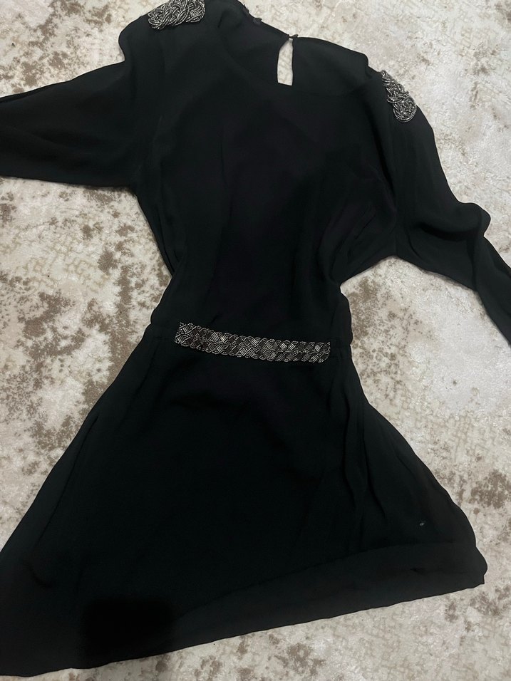 Yüksek yakalı, uzun kollu, kemer detaylı, uzun siyah gotik tarzda dar kesim elbise. Romantik akşamlar için uygun.