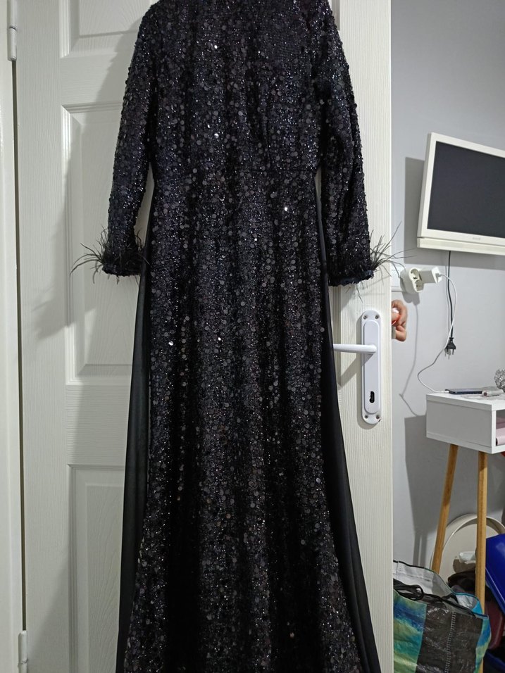 Uzun siyah gotik abiye elbise, dar kesim, uzun kollu ve yüksek yakalıdır. Desenli kumaş ve kollarında kürk detayları bulunur, parti için uygundur.