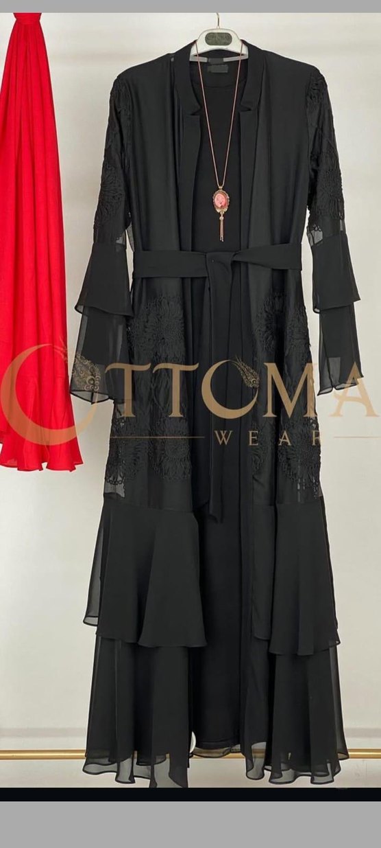 Uzun siyah gotik elbise, nakış detaylı, kesik yaka ve uzun kolludur. Sentetik kumaştan, drapeli ve klasik kesimlidir. İç elbisesi yoktur bir kere giyilmiştir